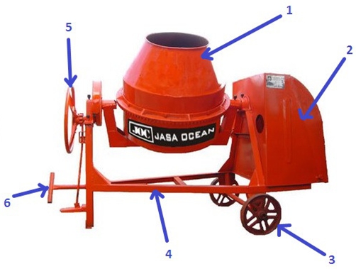 1)Tabung Aduk : Tabung aduk berupa bejana berbentuk silinder dengan bagian bawah tertutup dan lapisan atas berbentuk kerucut terpancung. Pada ujung atas kerucut terdapat lubang mulut tabung aduk untuk memasukkan bahan-bahan susun adukan beton dan untuk menumpahkan adukan beton setelah selesai dicampur. Di dalam tabung aduk terdapat daun-daun yang membantu mencampur bahan-bahan susunannya.
